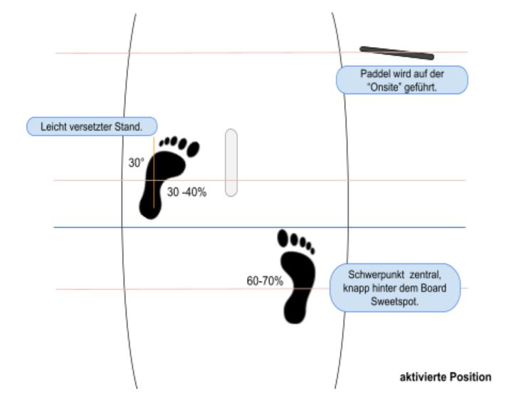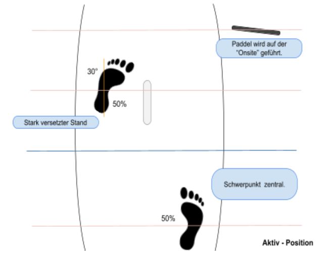- Variation: Vorderer Fuß Ballen über der Längsachse, hinterer Fuß Ferse über der Längsachse (Nachteil, keine laterale Kontrolle ohne Paddelstütze)