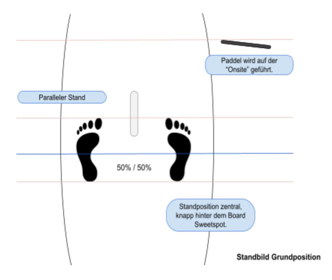 - Schulterbreiter Stand. Die Füße sind parallel oder ganz leicht versetzt. Der Standpunkt ist etwas hinter dem Sweetspot des Boards. Etwas hinter der Trageschlaufe in der Mitte des Boards.