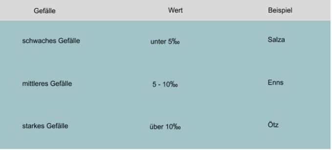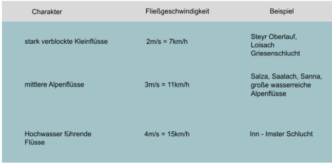 In den Ostalpen finden wir im wesentlichen zwei Flussgrößen, die sich aufgrund ihrer Wasserführung und ihrer Strömungsgeschwindigkeit typisch voneinander unterscheiden.