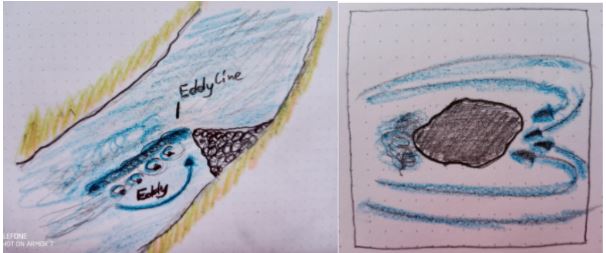 Je schneller die Hauptströmung, umso schneller das Kehrwasser. Dabei entsteht eine Verwirbelungslinie zwischen den beiden Strömungen. Diese wird Verschneidungslinie oder Eddy Line genannt.