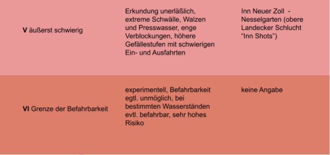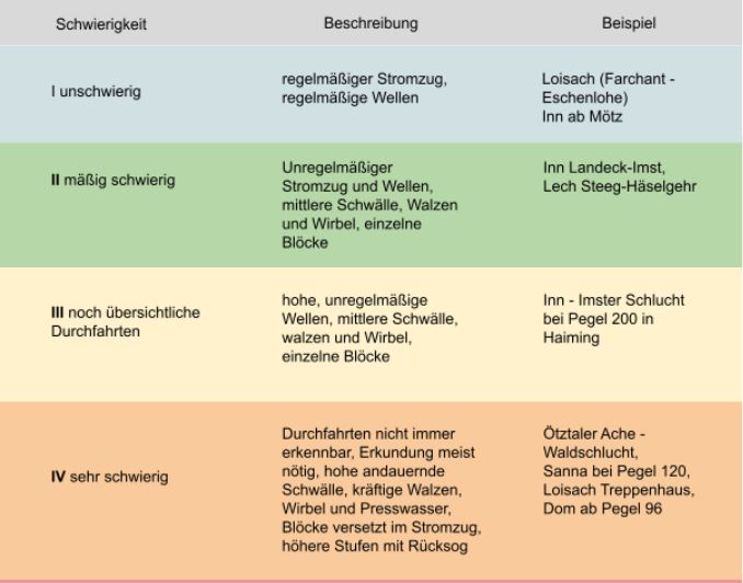 Der Wildwasser Schwierigkeitsgrad wir bemessen anhand einer Skala von I (unschwierig) bis VI (Grenze der Befahrbarkeit).