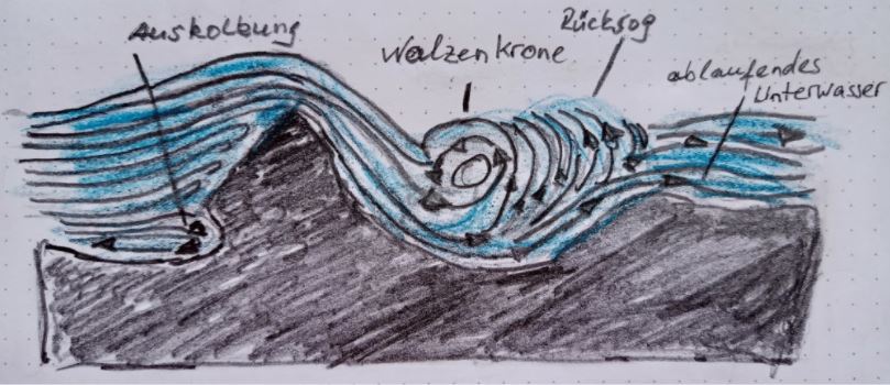 Das Unterwasser fließt in der Regel nach unten ab. Die Walze kennzeichnet eine konstante Rotation.