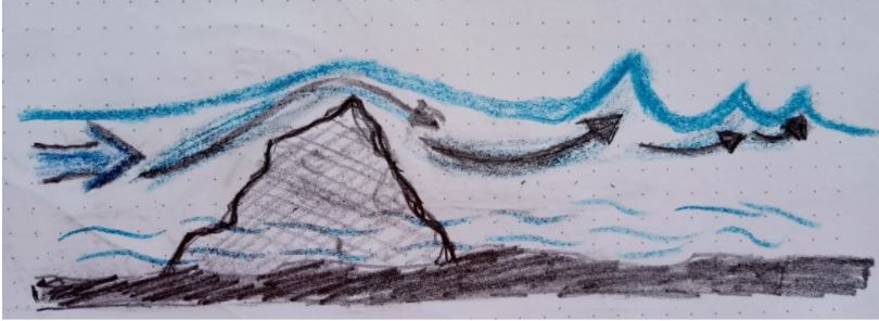 Wenn das fließende Wasser an einem Hindernis ein Prallpolster erzeugt hat, fließt es anschließend um das Hindernis herum.